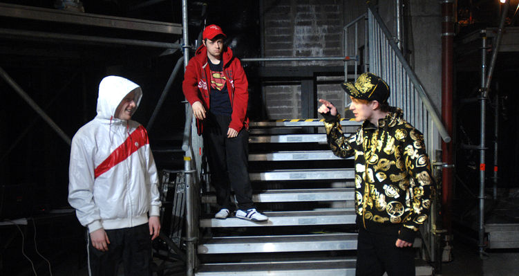 A disused warehouse on Smithfield Square, next to the Lighthouse Cinema, was converted into a temporary theatre for the play. The set is a scaffolding installation, sculpted to give an abstract representation of an inner city flats complex, with balconies, stairwells, and hidden corners.